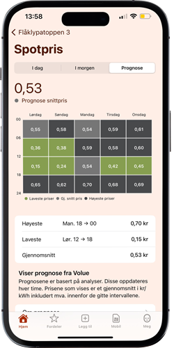 Du kan enkelt finne prognosen i appen ved å trykke på spotpris-flisen. Øverst vil du se en menylinje hvor du kan velge om du vil se strømprisene i dag, i morgen eller en prognose. Når du trykker på prognose vises en tabell med forventede priser de neste fem dagene. Totalt kan du få oversikt over spotprisen i en uke frem i tid. Hvis du ikke finner den i appen anbefaler vi at du laster ned den nyeste oppdateringen.